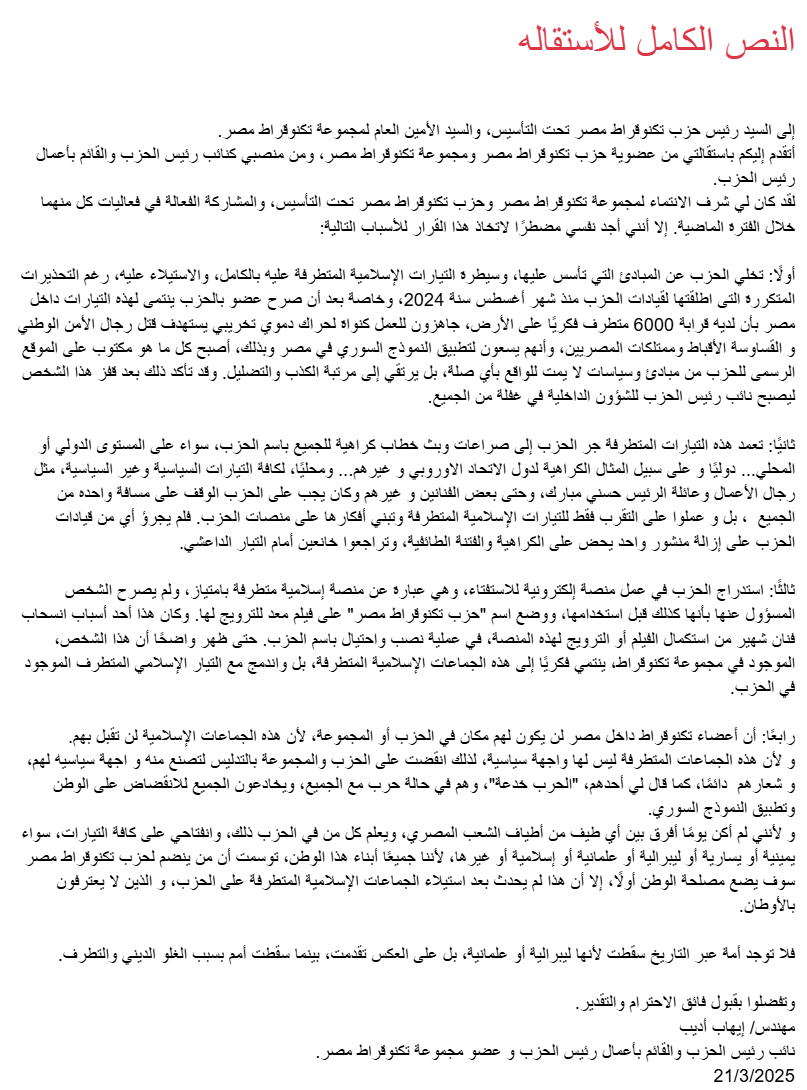 استقاله المهندس إيهاب أديب من حزب و مجموعة تكنوقراط مصر